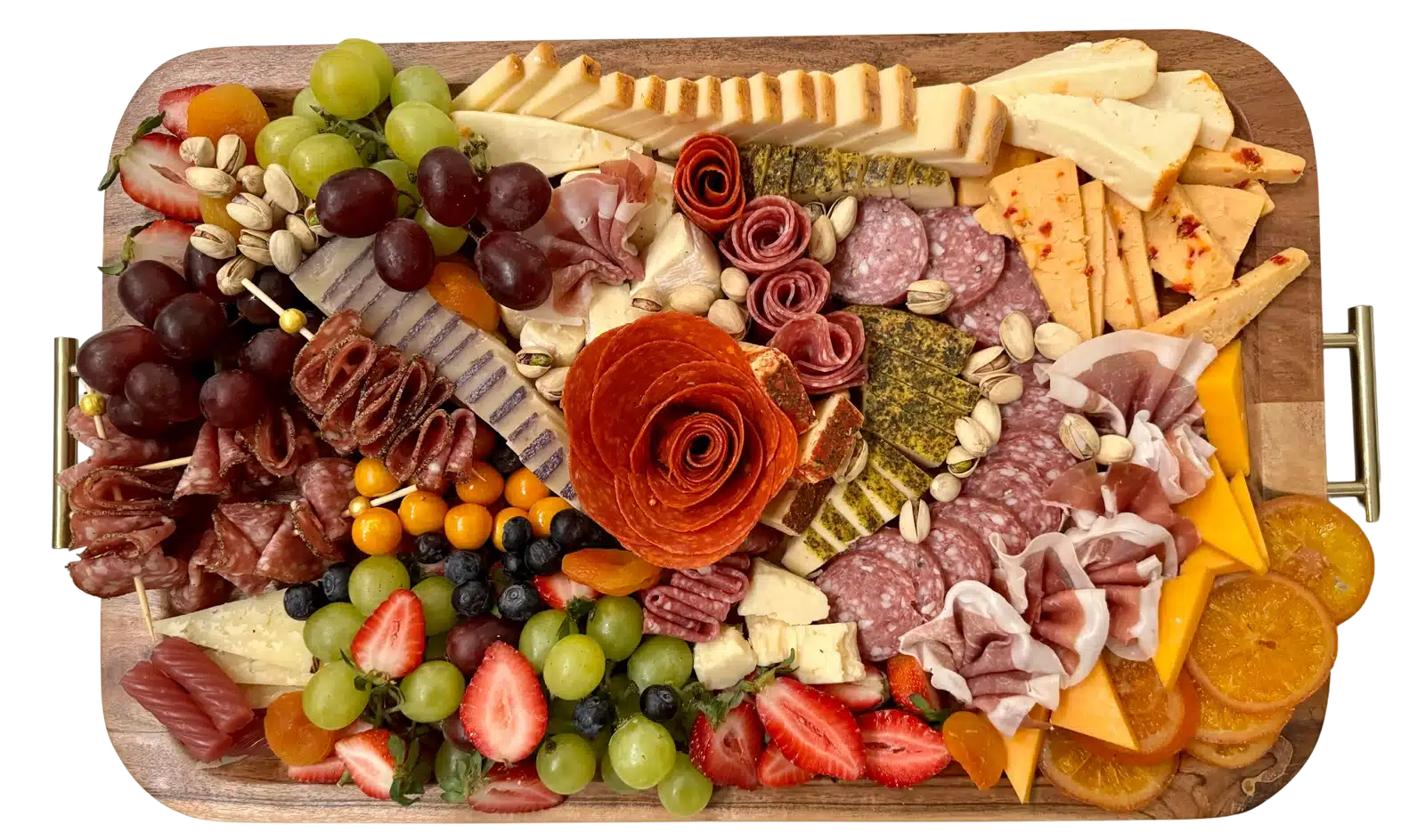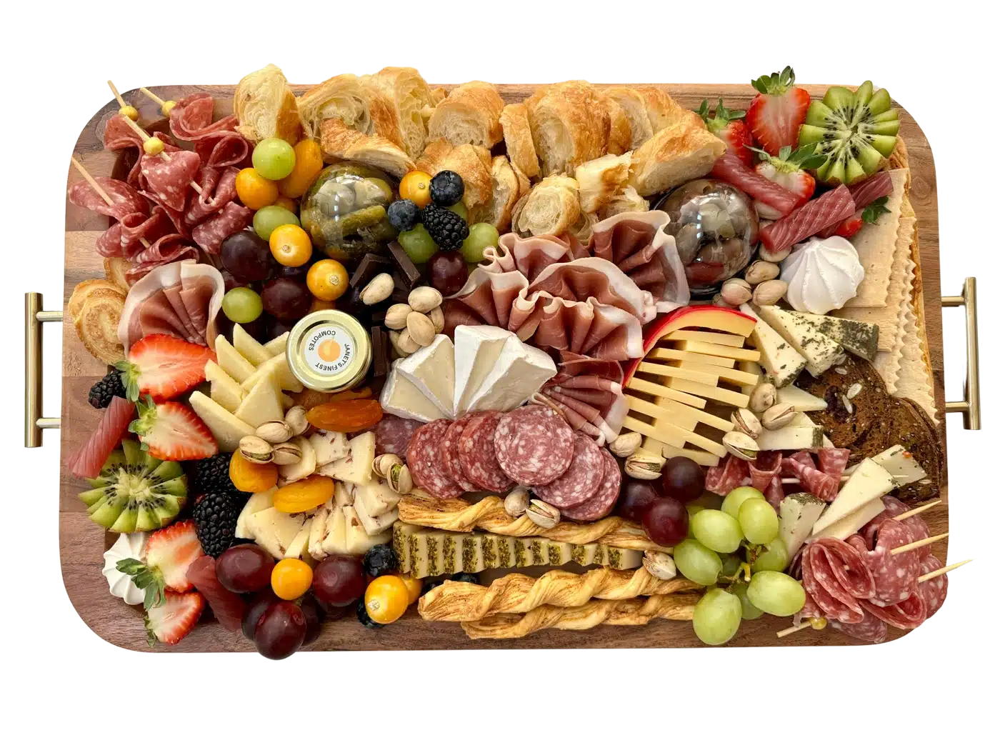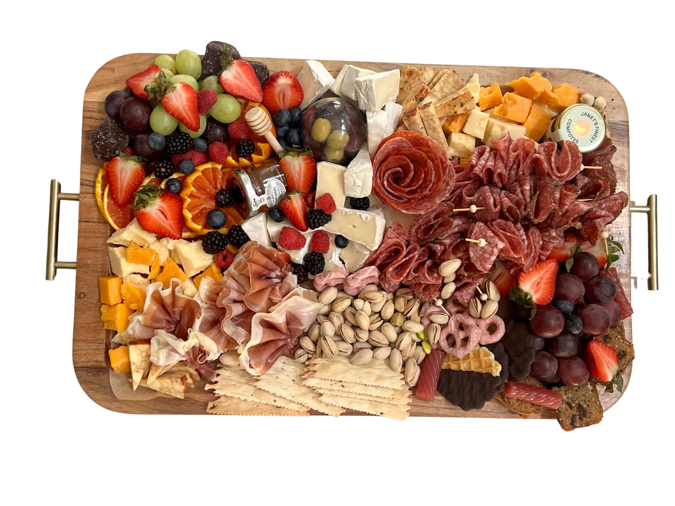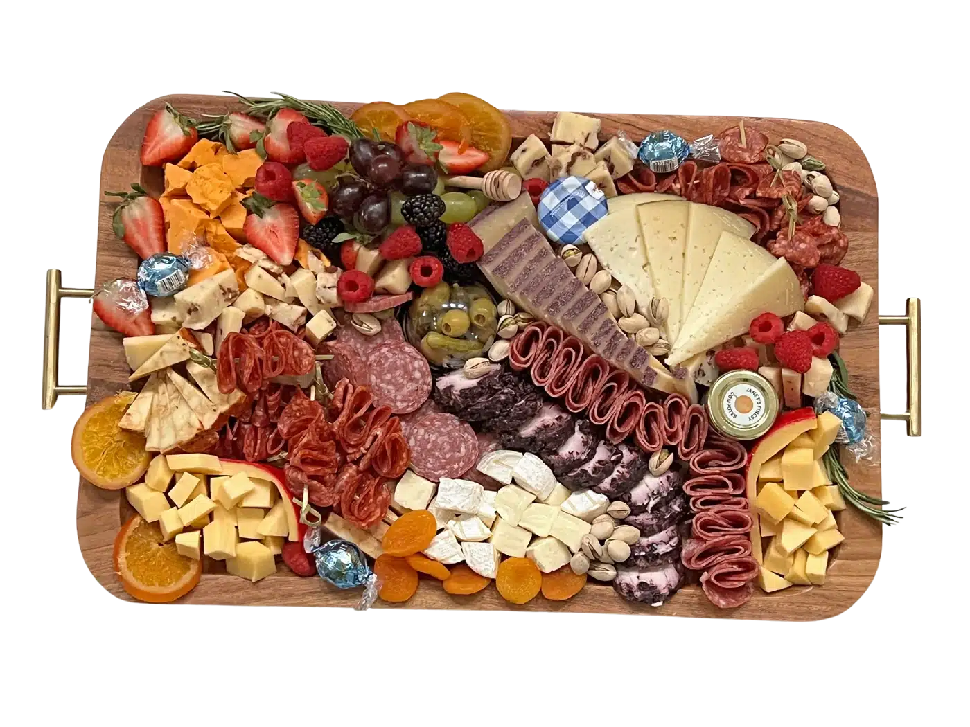 Each board comes on a beautifully finished acacia wood 22″ x 13.5″ rectangular board with gold handles and features a generous selection of meats, cheeses and accompaniments designed to serve 15-20 guests, making it perfect for small gatherings or professional events. It features a generous selection of over 10 oz of cured meats, paired with 60 oz of premium cheeses. It’s thoughtfully accompanied by a vibrant array of seasonal organic fresh fruits, pickled vegetables, artisan honey, flavorful compote, dried fruits, nuts, and gourmet chocolates. Finished with fresh herbs for an elegant touch, each board includes a honey dipper, serving utensils, and two sleeves of crackers. Every creation is artfully arranged and beautifully wrapped for presentation. (Halal options available.)