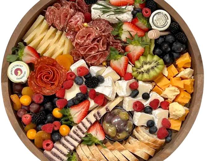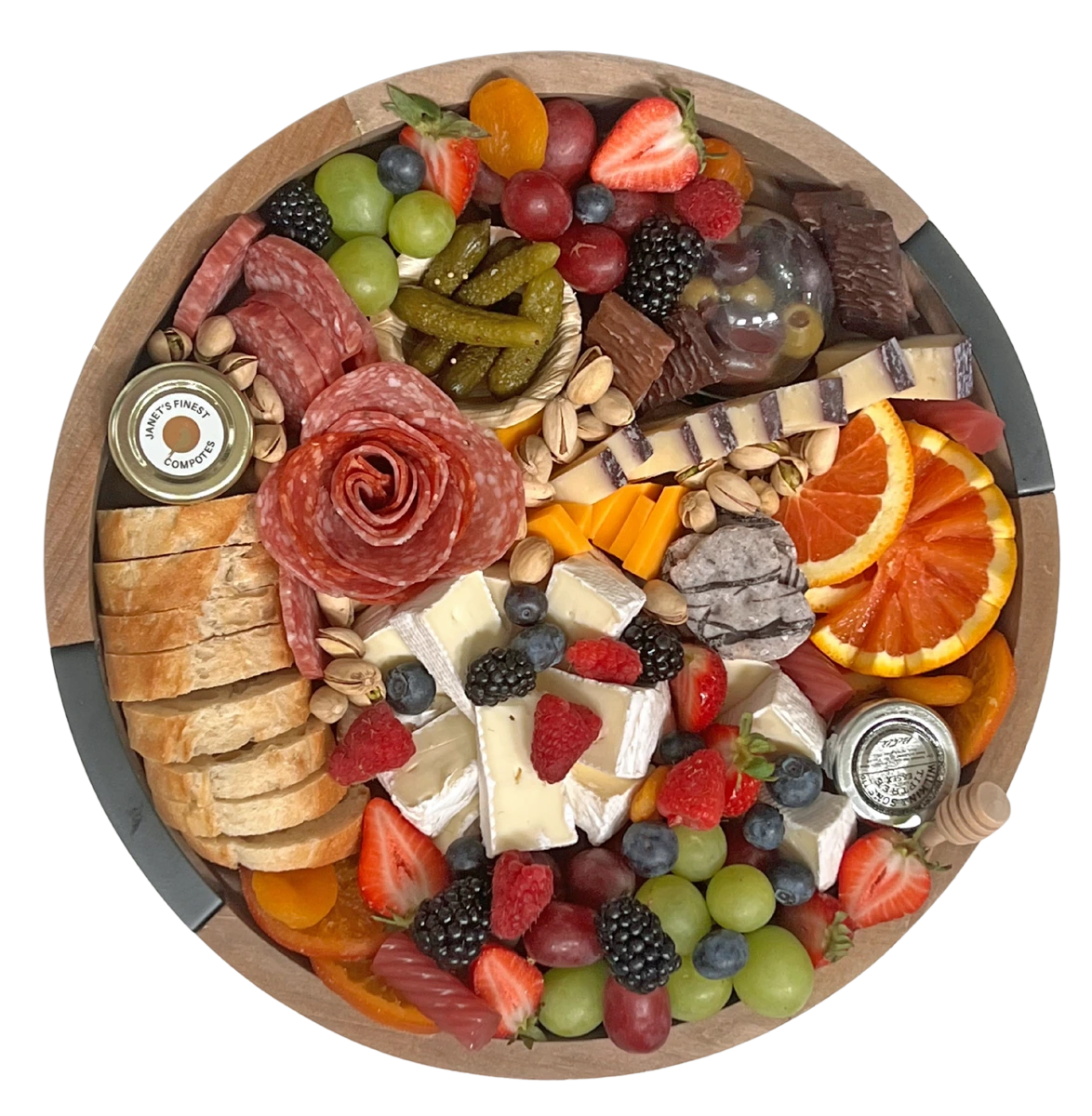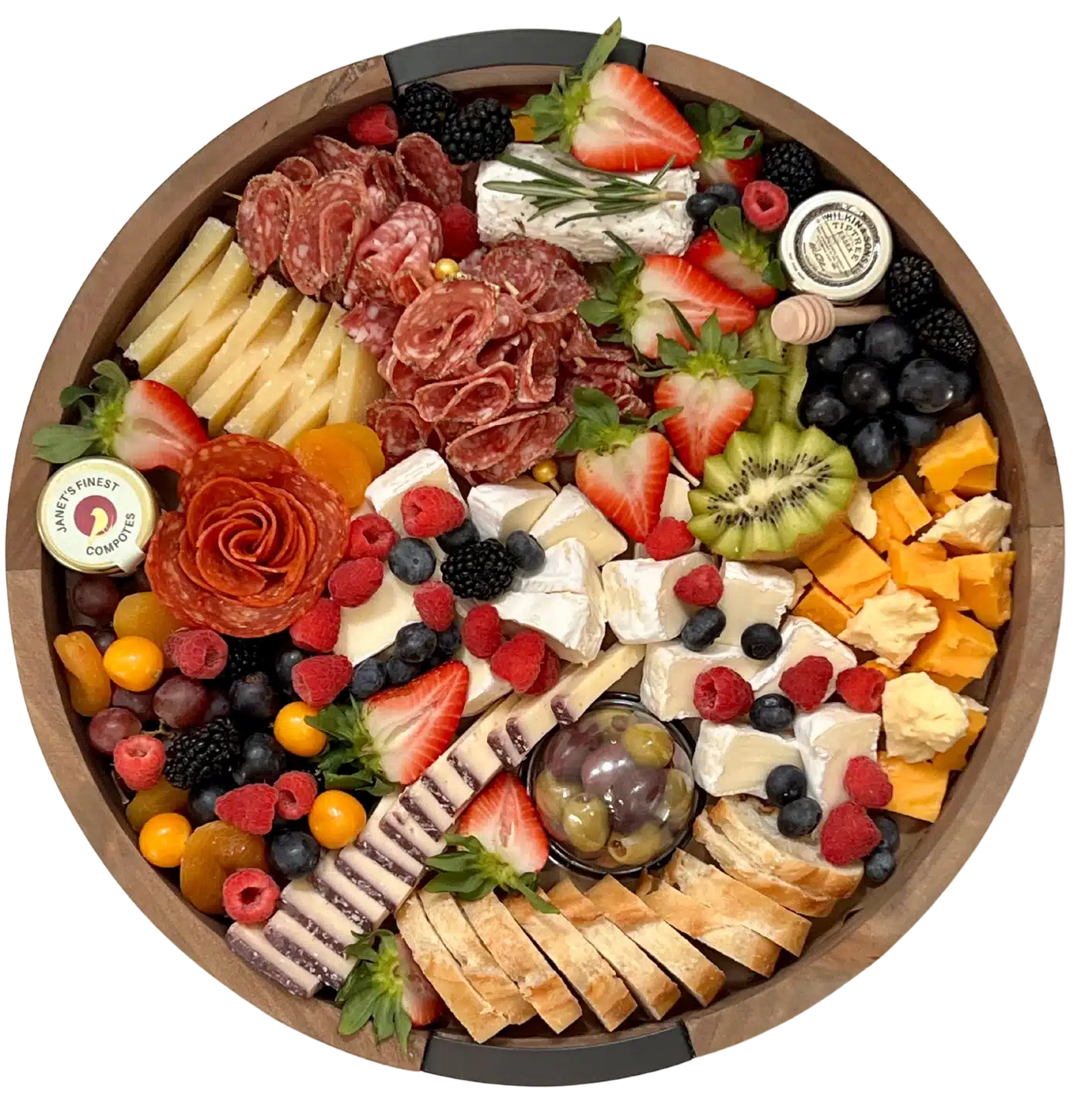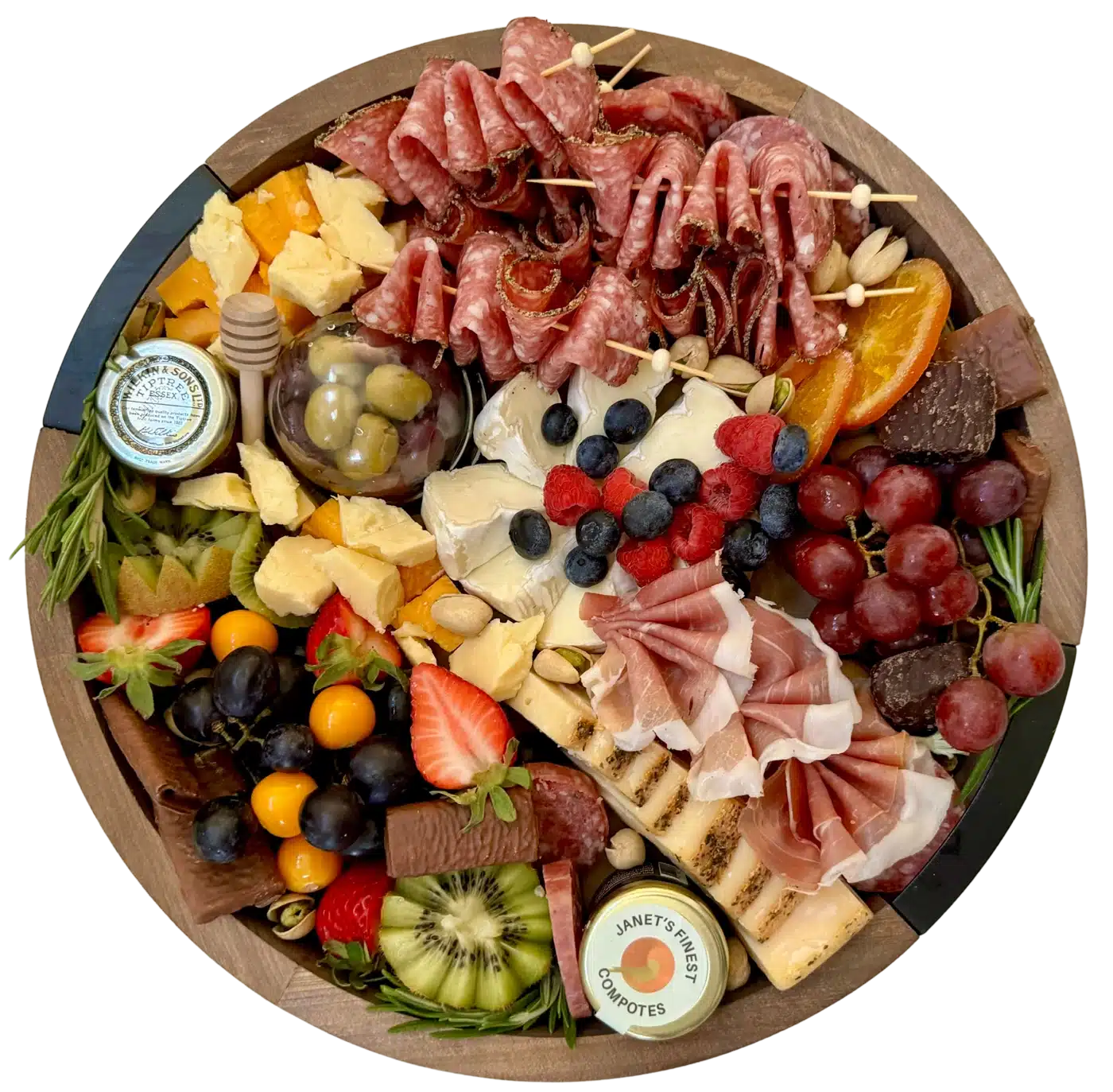 Our beautifully crafted 14″ round board features a generous selection of meats, cheeses and accompaniments designed to serve 4-6 guests, making it perfect for small gatherings or professional events. It features a generous selection of over 10 oz of cured meats, paired with 16 oz of artisan cheeses. It’s thoughtfully accompanied by a vibrant array of seasonal organic fresh fruits, seasonal fruits, artisan honey, flavorful compote, dried fruits, nuts, and sweet treats. Finished with fresh herbs for an elegant touch, each board includes a honey dipper, serving utensils, and crackers. Every creation is artfully arranged and beautifully wrapped for presentation. (Halal options available.)