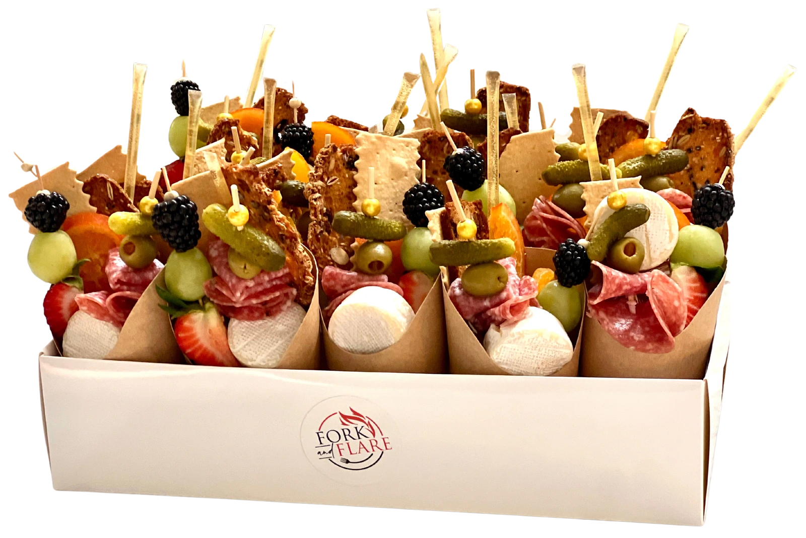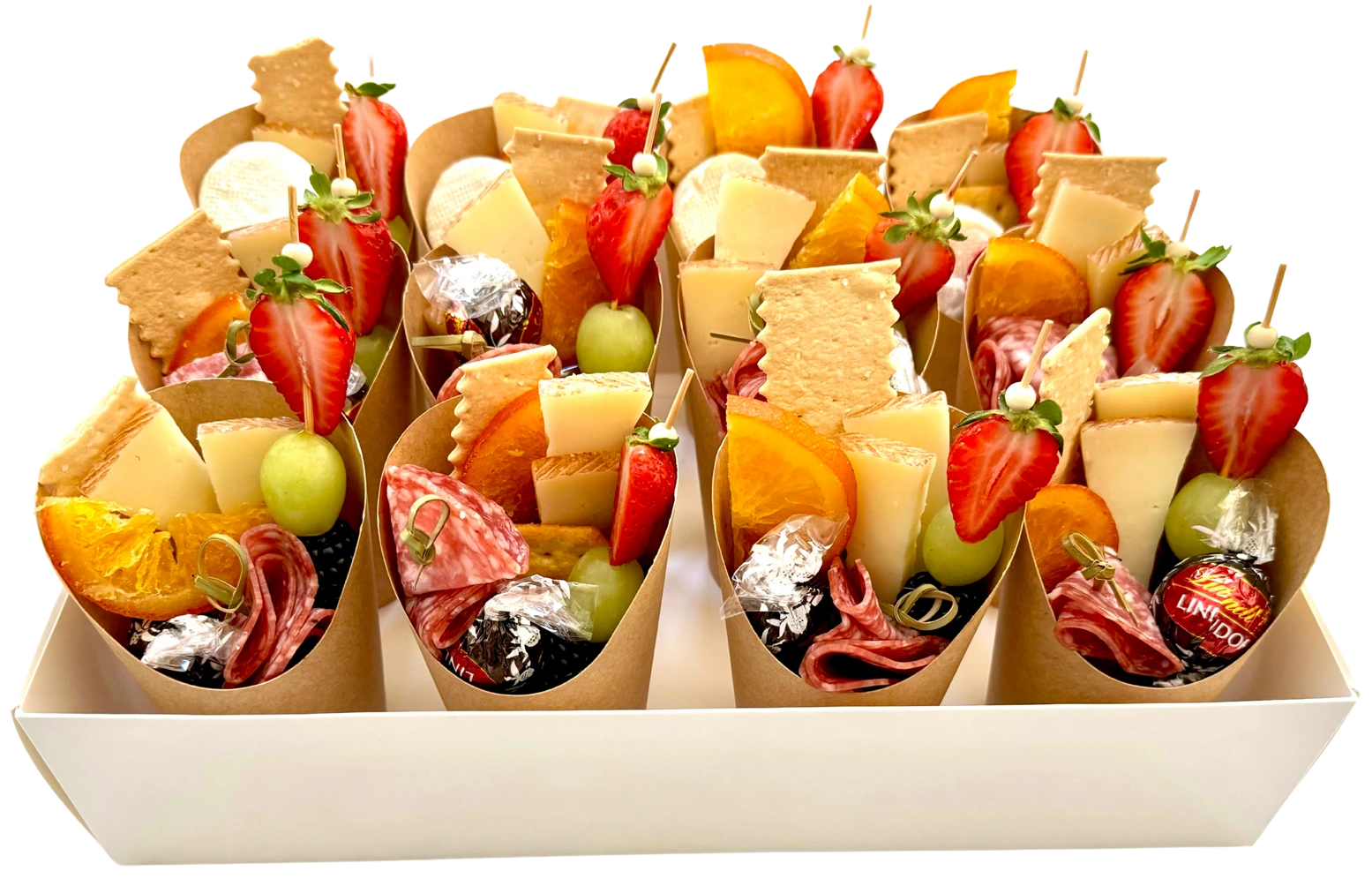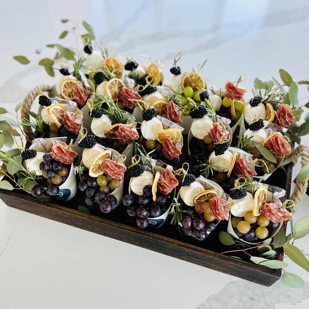 Our charcuterie cups are a delicious and elegant way to enjoy a personal-sized charcuterie experience! Each cup is beautifully arranged with a selection of premium cheeses, cured meats, fresh fruits, nuts and a sweet treat. Offering the perfect balance of flavors in a convenient, mess-free presentation.