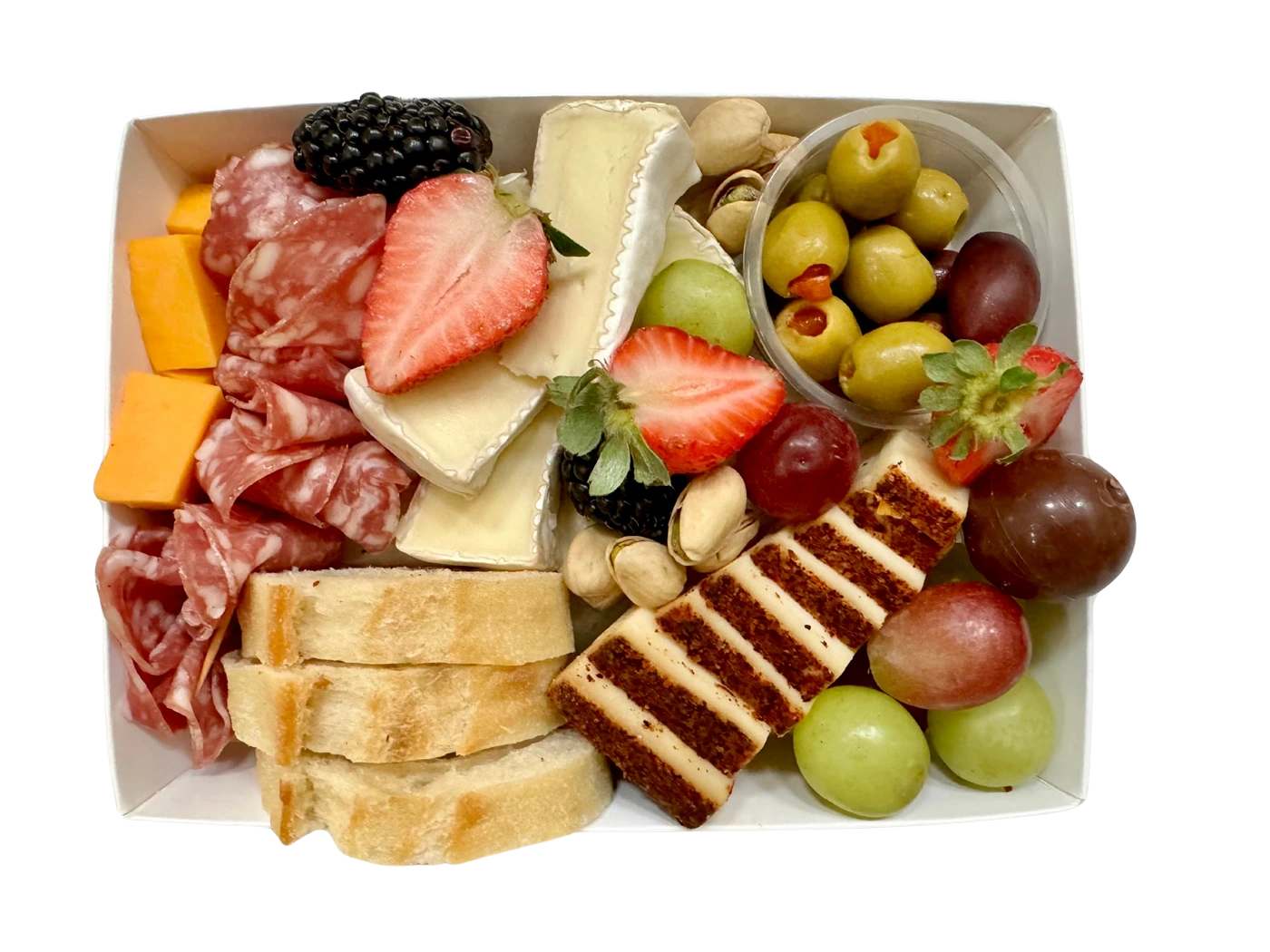 Perfectly portioned for one to two people, our Mini Charcuterie Box and offers a curated selection of premium cheeses, artisanal cured meats, fresh fruits, and savory bites. Each box is 7″ x 5″ and includes two types of premium cheeses, cured meat, juicy strawberries, crisp grapes, briny olives, crunchy pistachios, and slices of fresh baguette — all beautifully arranged and ready to enjoy.