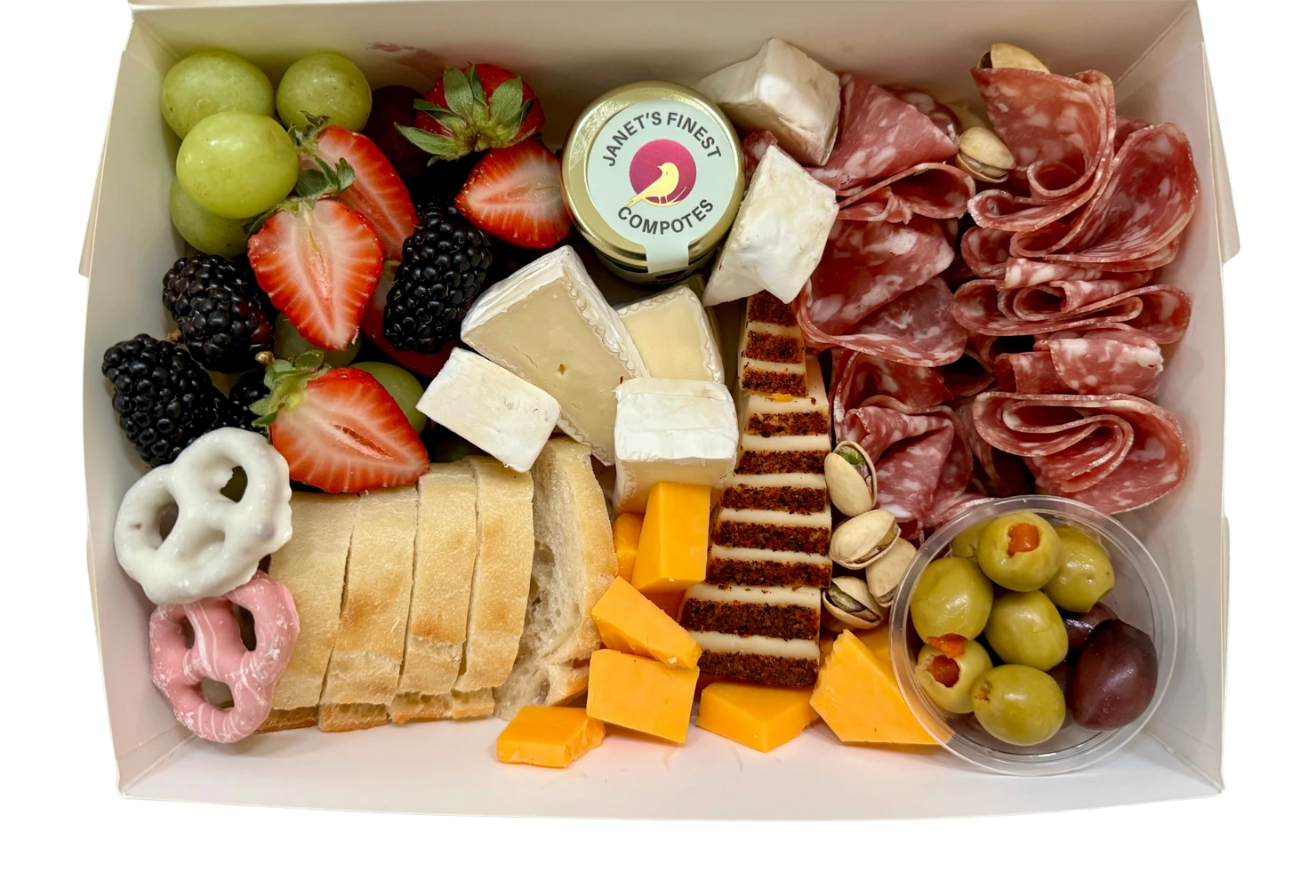 Our Small Charcuterie Box is a perfectly portioned indulgence, thoughtfully curated to deliver a rich and satisfying grazing experience. Beautifully arranged on a 9″ x 6″ disposable box, each box includes a selection of premium cheeses, artisan cured meats, fresh seasonal fruits, olives, pistachios, and slices of fresh baguette — offering a balanced mix of sweet, savory, and salty bites.